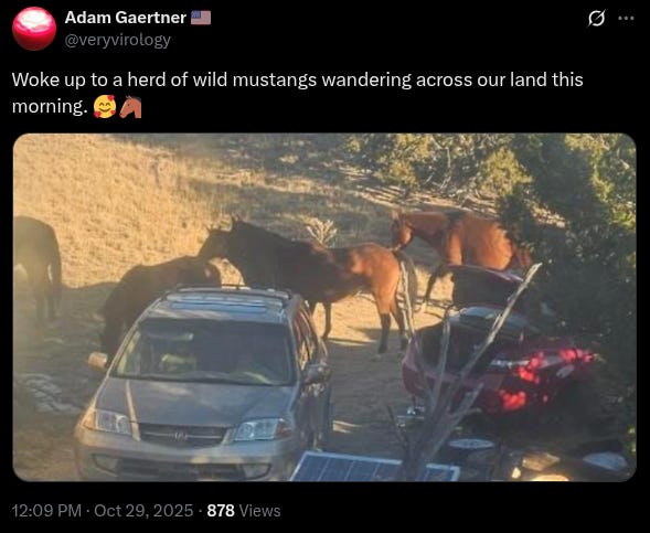 We’ve been completely off-grid, 30 miles from the middle of nowhere, for the better part of this year. No road, no utilities, pretty much nothing at all but for sun, land and wind, wild horses, time, and a Starlink that has enabled us to carry on our work. If we’ve managed to stay in touch, we’ve probably talked about it, and if not - well - now you know, and we probably miss you, so come say hi. The comments are open below. Maybe Substack could become what Twitter used to be.